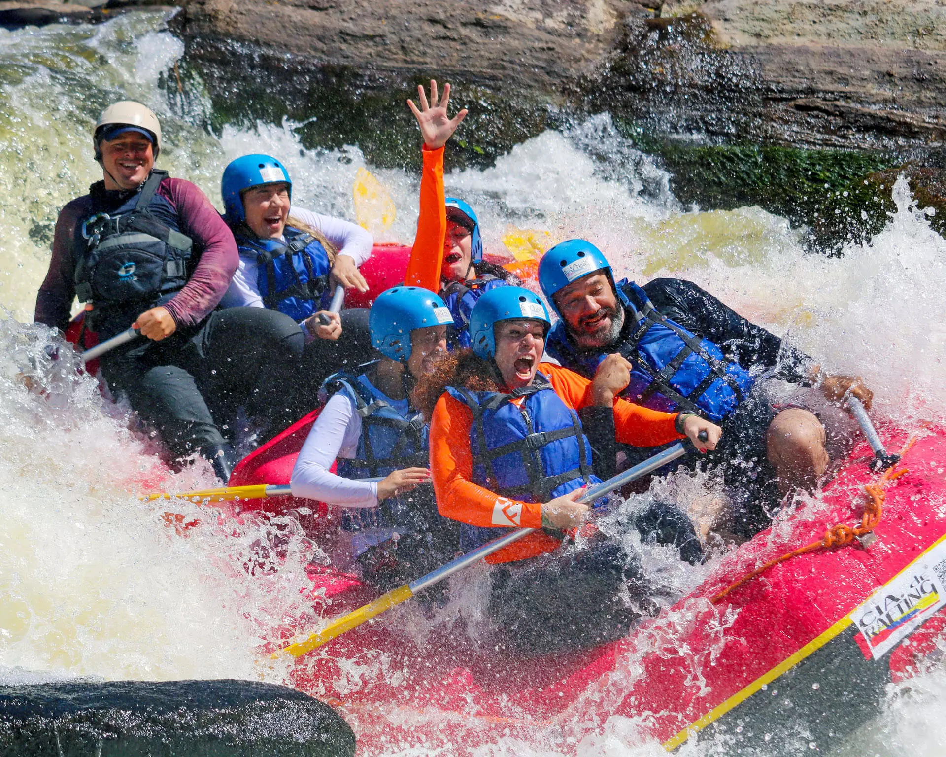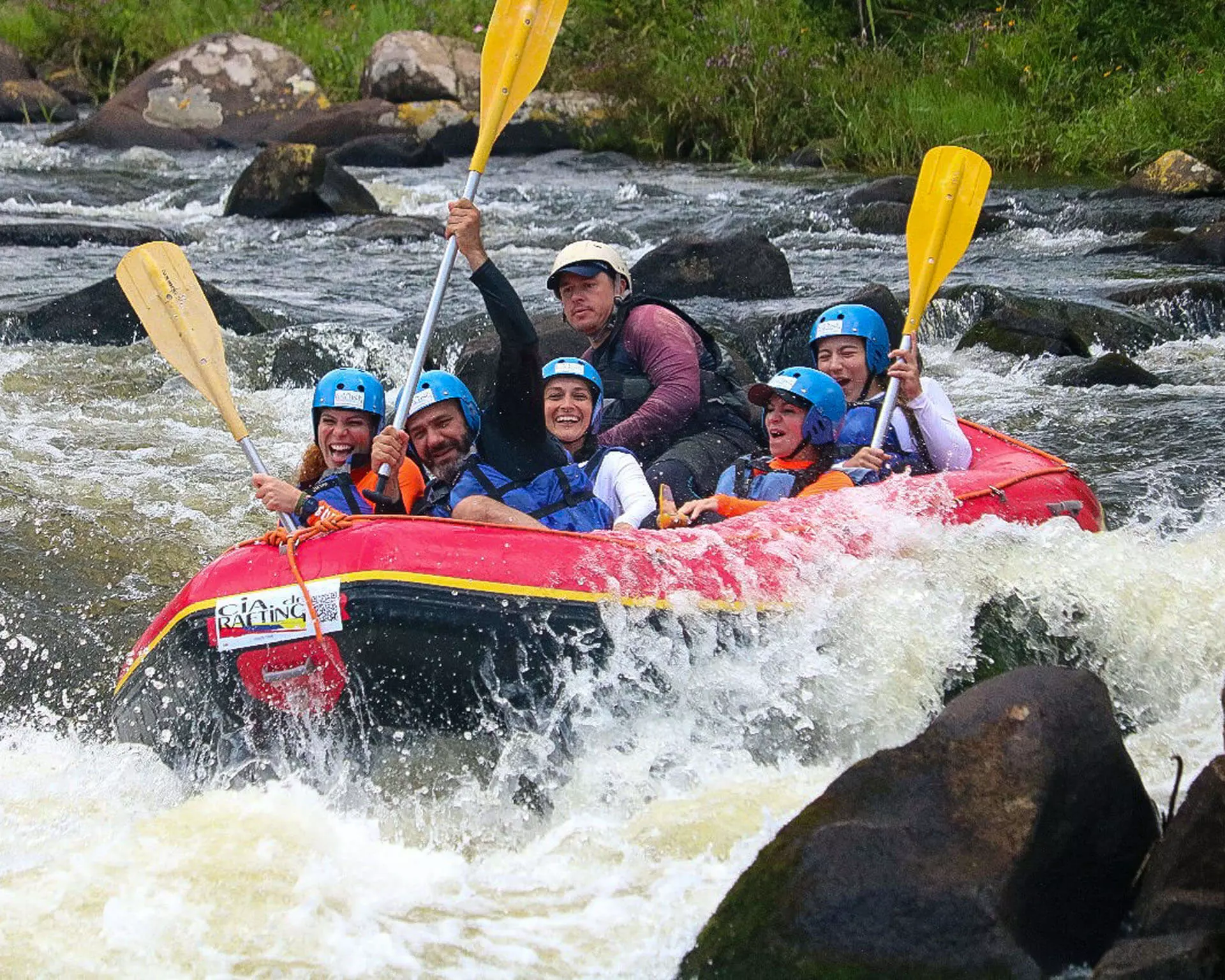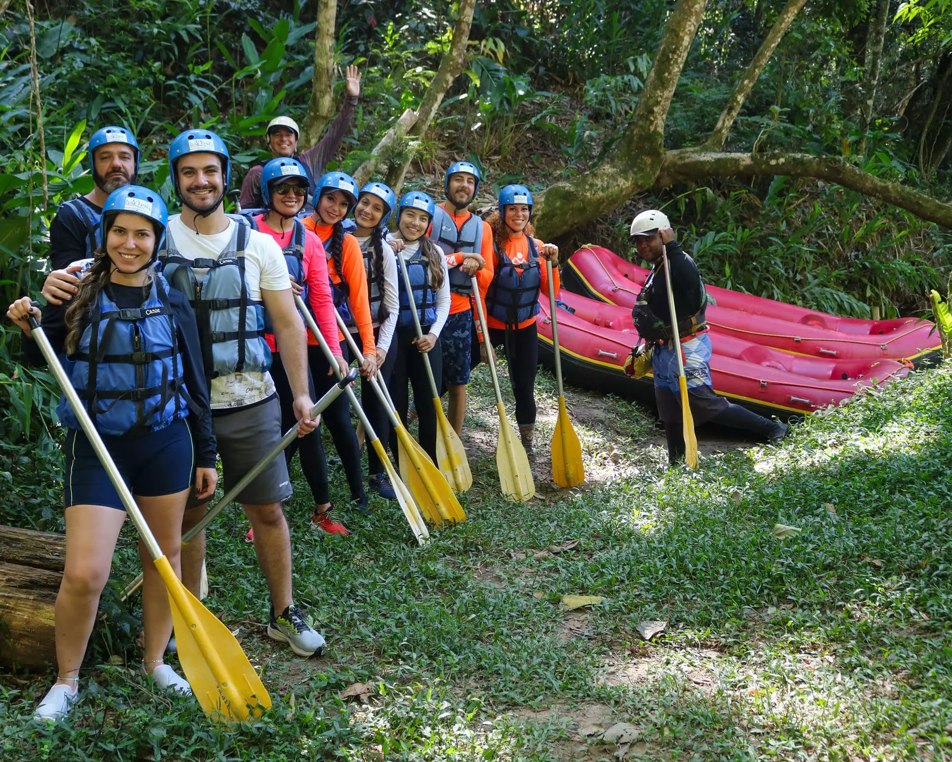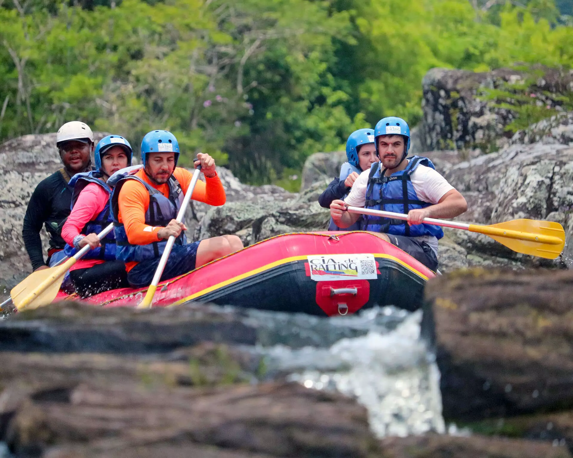 Todos vão se equipar com capacetes, colete salva-vidas, remos e embarcar com sua equipe dentro do bote. E bora pra adrenalina!