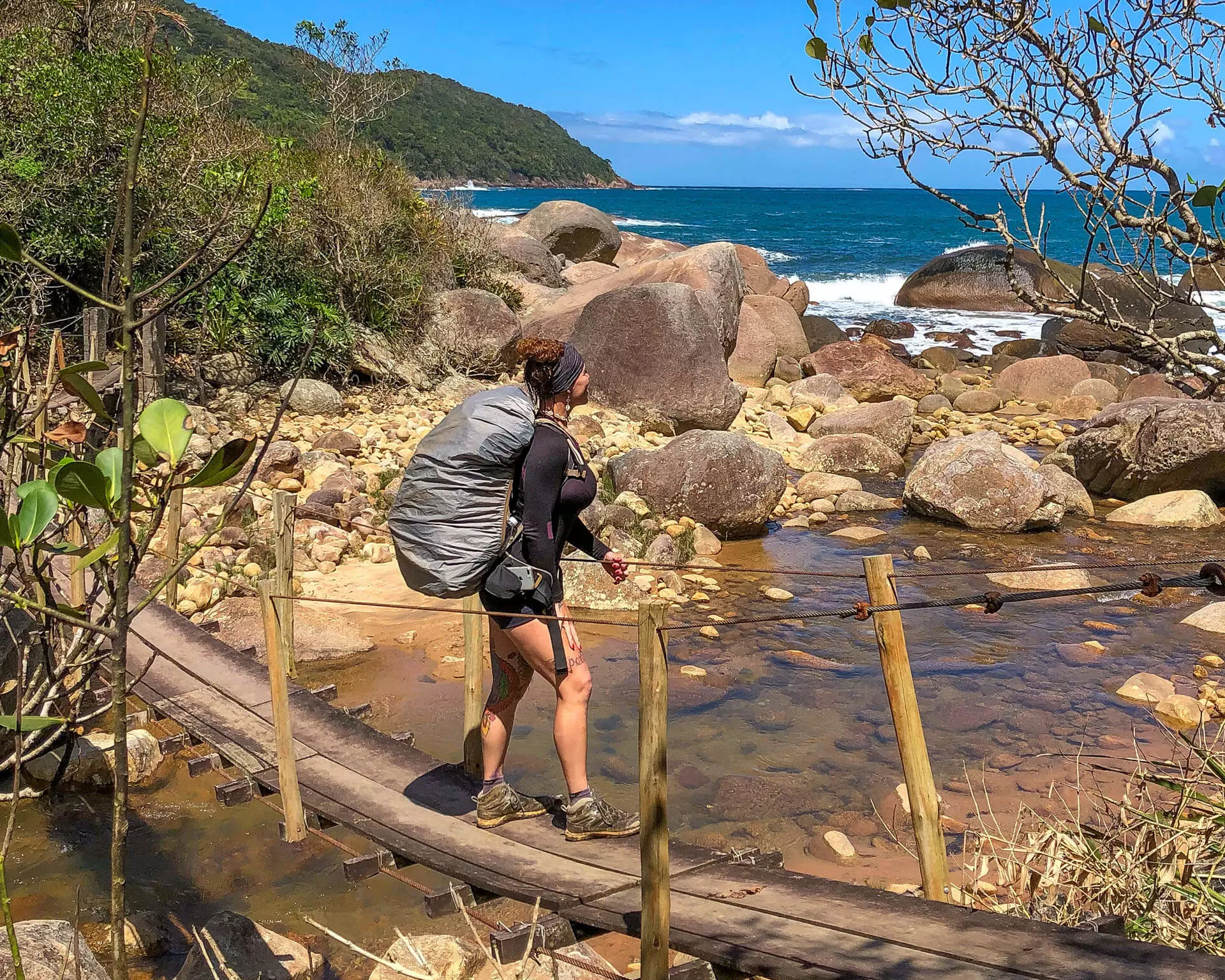 Roupa confortável ou própria pra trilha, tudo depende de qual roteiro irá realizar, se é praia ou montanhas, bate-volta ou travessias, tenho check list disponibilizado para cada tipo de roteiro. Mas se estiver começando não se preocupe, é possível iniciar com o que você tem, fale comigo que lhe darei dicas específicas.